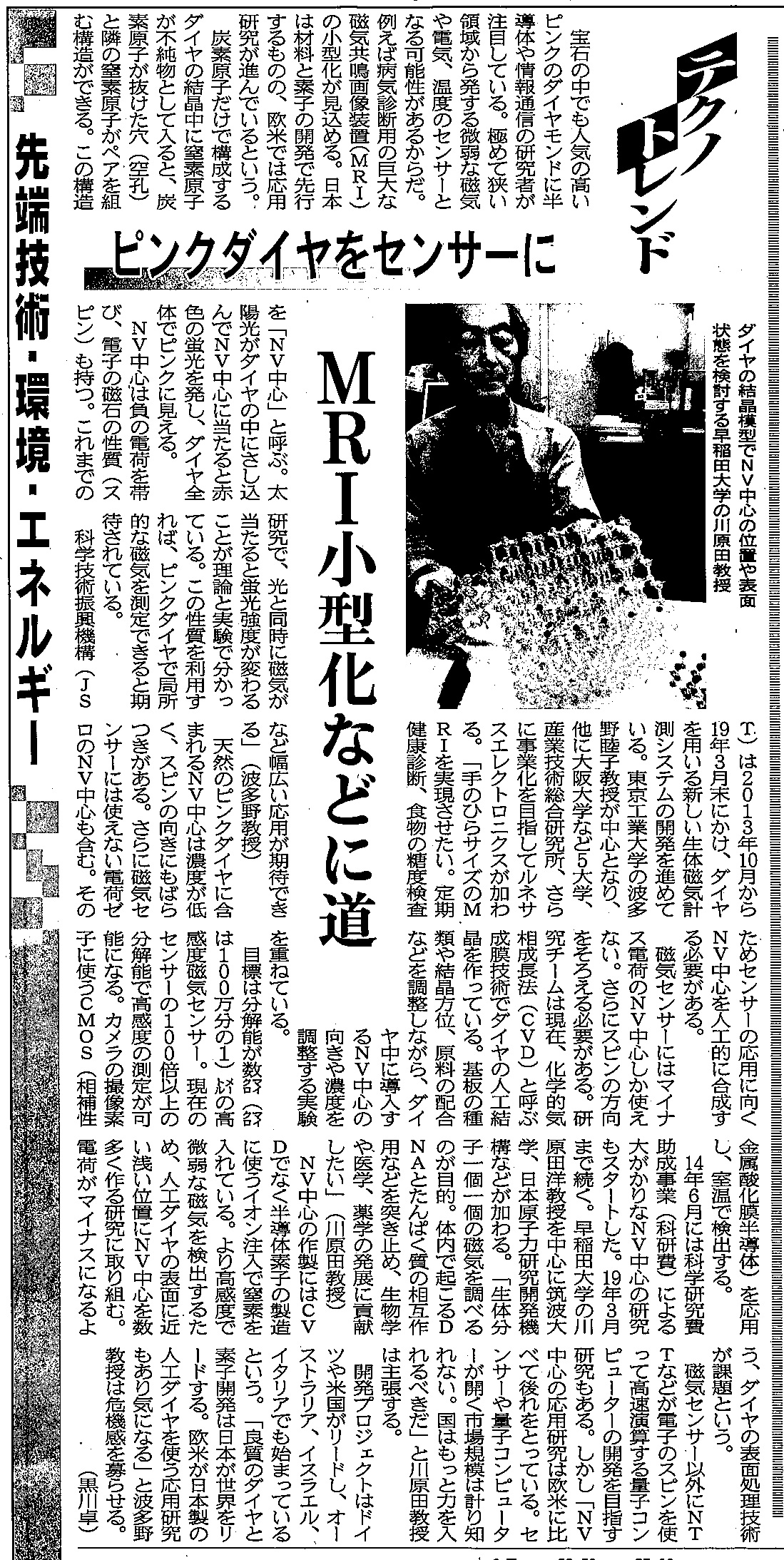 Research about diamond contains NV-Center (日経産業新聞,2015/05/01 第7面 より転載) 参考ページ